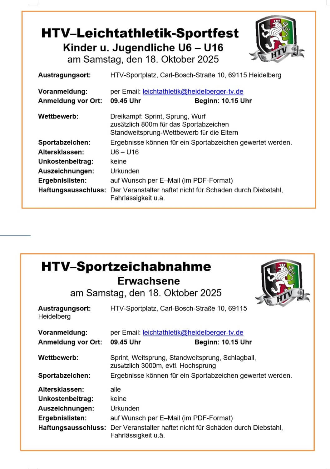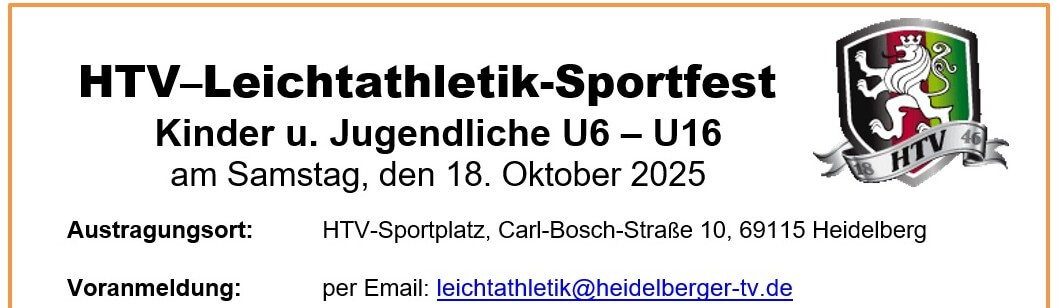 Wie jedes Jahr findet im goldenen Oktober unser vereinsinternes Sportfest auf dem HTV-Platz statt! Dies ist immer noch mal ein schöner Abschluss, bevor wir nach den Herbstferien für das Wintertraining in die Halle wechseln. Wir freuen uns auf möglichst viele Teilnehmer (Kinder u. Jugend). Alle Infos findet ihr im Anhang. Für alle Erwachsenen und zuschauenden Eltern bieten wir die Sportzeichenabnahme an! Anfänger u. Könner gleichermaßen können antreten 🙂