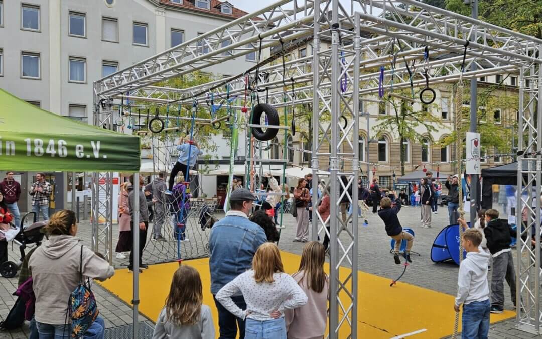 Fast schon traditionell kam der Spätsommer zum Herbst-Wochenende in Heidelberg nochmals zurück. Umso besser, dass sich der HTV am zum „Sportplatz“ umfunktionierten Ebert-Platz mit der Ninja-Warrior-Anlage präsentieren konnte. Der Platz war gut besucht und so war an unserer Anlage immer was los – Kinder, Jugendliche und Erwachsene wollten einmal echte Ninjas sein und in schwindelerregender Höhe durch das Traversensystem hangeln.